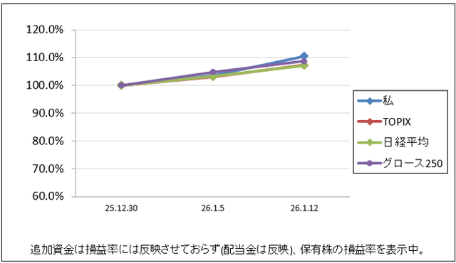 先週比は私が+7.0%、TOPIXが+4.2%、日経平均が+4.0%、グロース250が+4.0%でした。