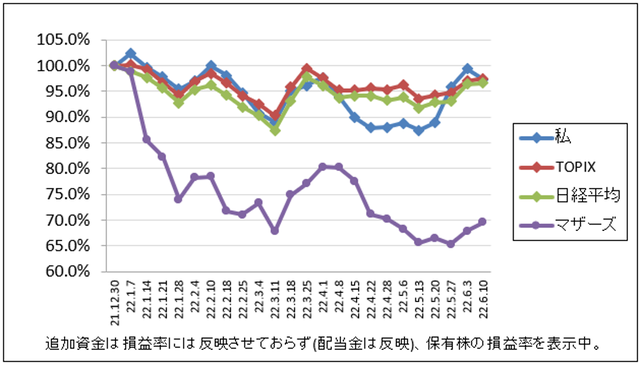 先週比は、私が-2.0%、TOPIXが0.5%、日経平均が0.2%、マザーズが1.7%でした。