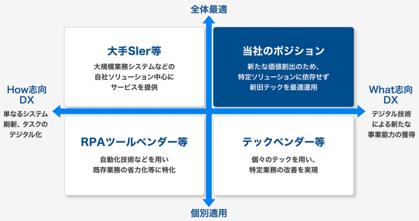 あまり意味が分かりませんが「新たな価値創出のため、特定ソリューションに依存せず、新旧テックを活用していく」会社のようです。