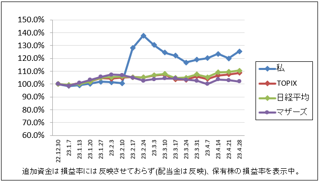 先週比は私が+5.6%、TOPIXが+1.2%、日経平均が+1.1%、マザーズが-1.0%でした。