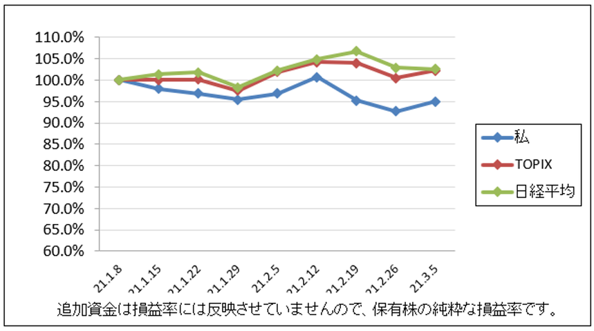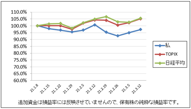 先週比は私は+2.4%、TOPIXは+3.0%、日経平均は+3.0%でした。
