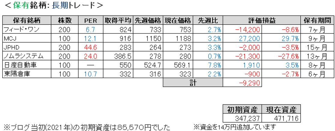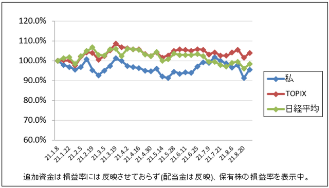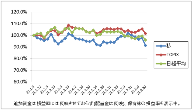 先週比は私が+4.4%、TOPIXが+2.6%、日経平均が+2.2%でした。地合い良かったんですね。