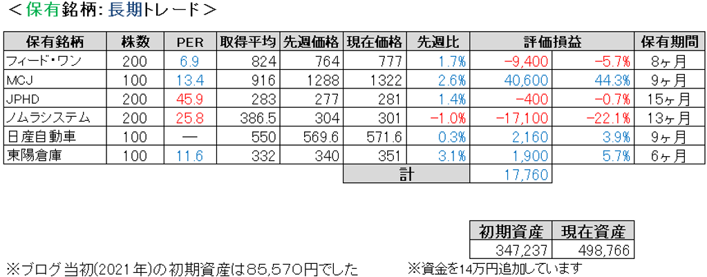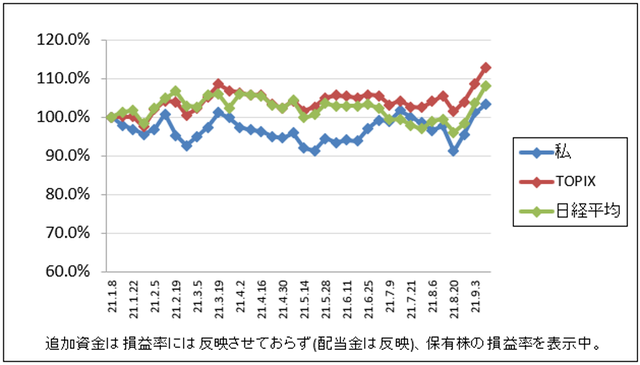 先週比は私が-1.8%、TOPIXが-0.5%、日経平均が-0.9%です。