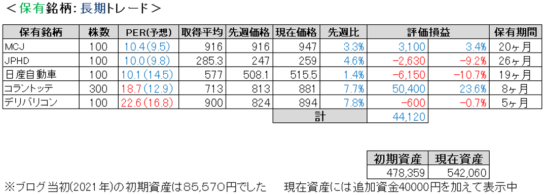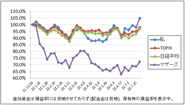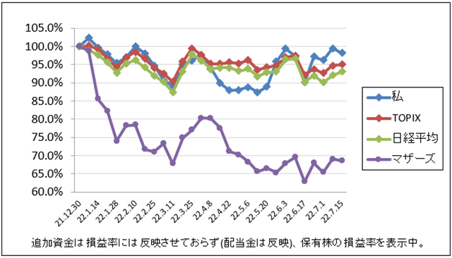 先週比は私が+1.3%、TOPIXが-0.8%、日経平均が-0.4%、マザーズが+0.6%でした。