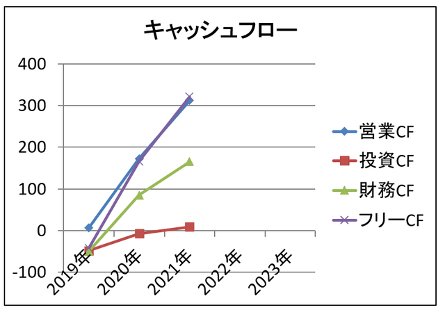 営業CFは2年連続プラスで増加中です。しっかりと本業で稼いでいるようです。