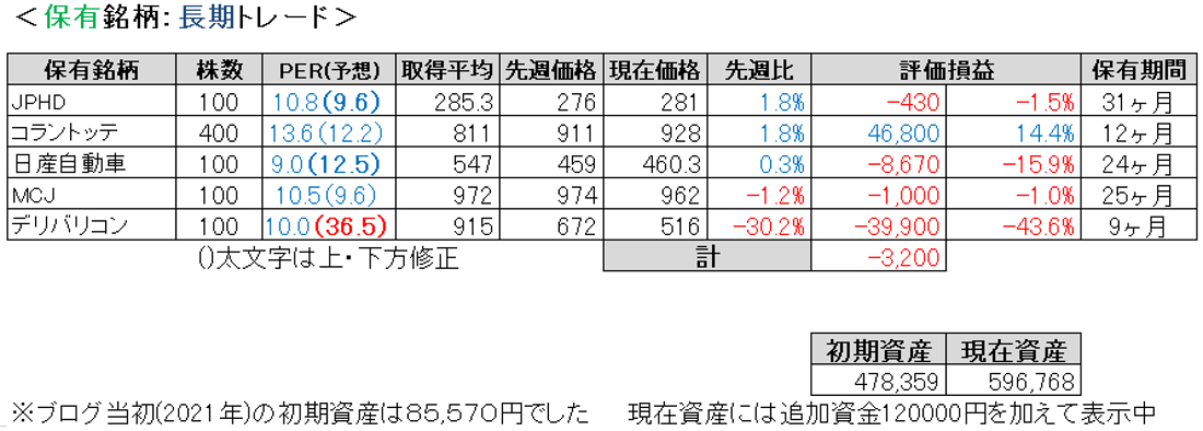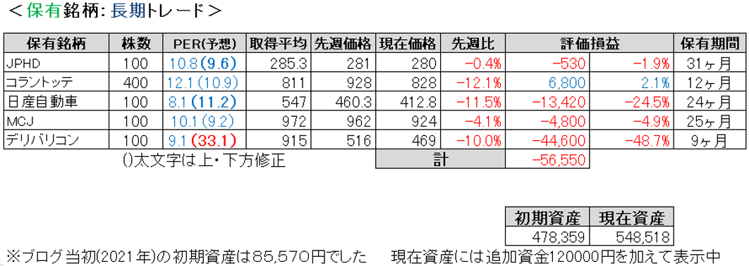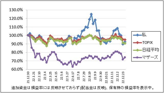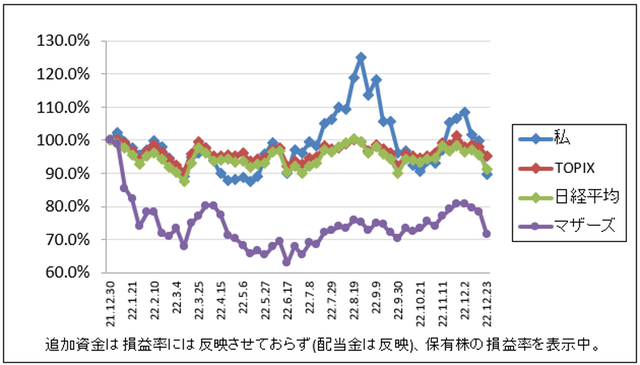 先週比は私が+3.0%、TOPIXが-0.3%、日経平均が-0.5%、マザーズが+2.3%でした。