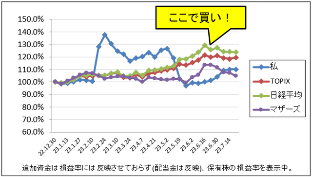 先週比は私が+2.6%、TOPIXが+1.5%、日経平均が+1.7%、マザーズが-0.2%でした。
