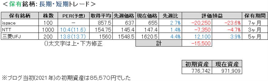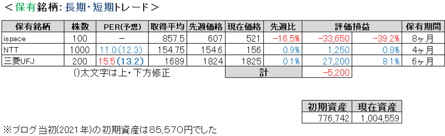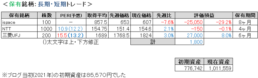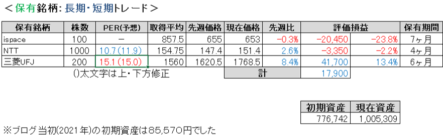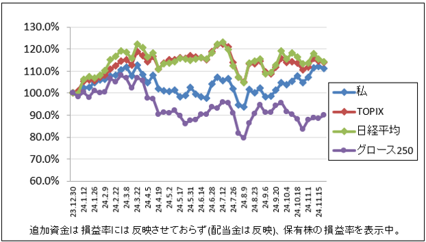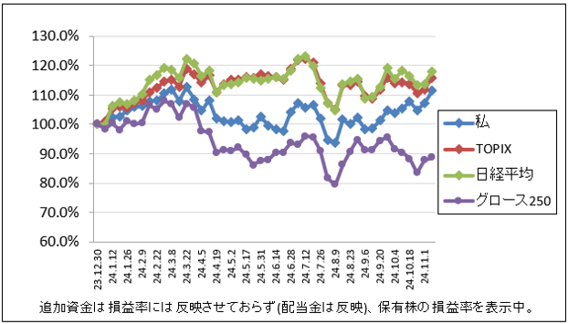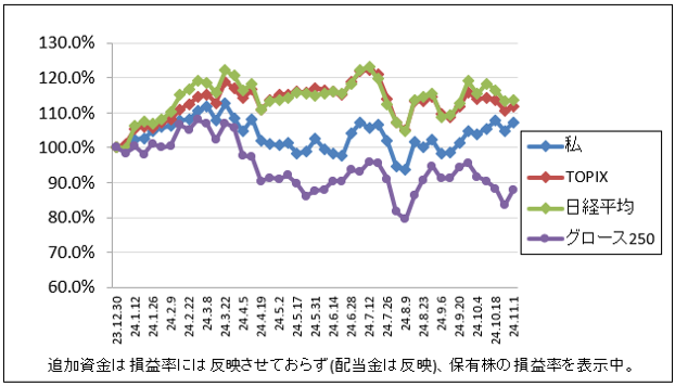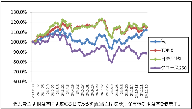 先週比は私が-0.9%、TOPIXが-0.6%、日経平均が-1.1%、グロース250が+1.3%でした。