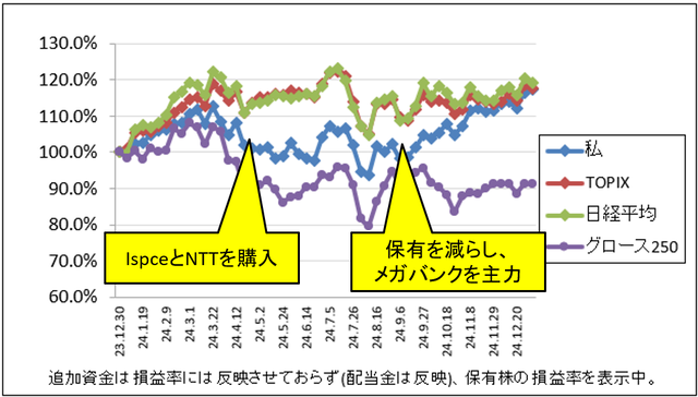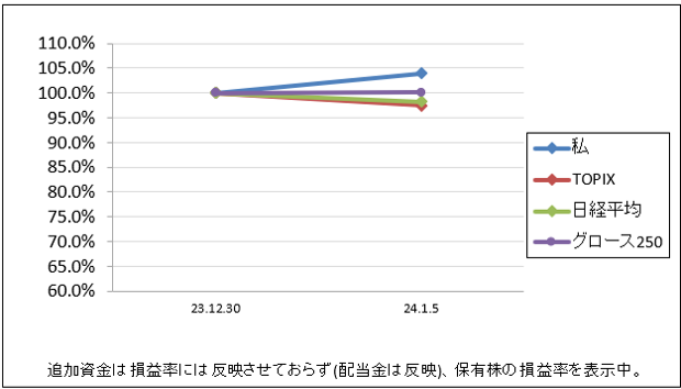 先週比は私が+1.9%、TOPIXが+1.4%、日経平均が-0.9%、グロース250が+1.5%でした。