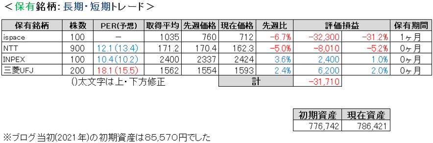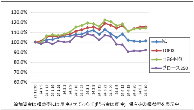 先週比は私が+0.6%、TOPIXが-0.01%、日経平均が+0.5%、グロース250が+1.0%でした。