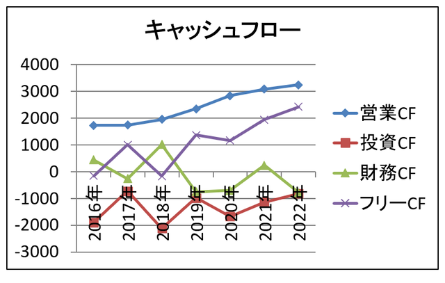 営業CFは、ずっとプラスです。投資CFも財務CFもマイナスがあり、投資もしているし、借金返済のやり繰りもしている様子。