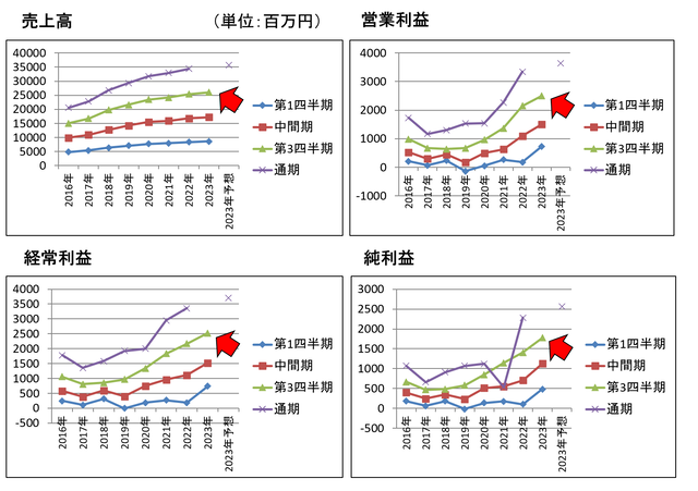 売上高などの推移はこちら(今期が赤矢印)。